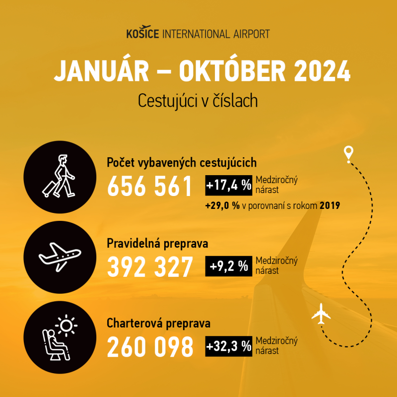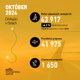 Z roku 2024 uplynulo ešte len desať mesiacov a Letisko Košice už môže hlásiť rekordný rok. Vlaňajšok zakončilo s vyše 625-tisíc vybavenými cestujúcimi, pričom za obdobie január – október tohto roka prešlo jeho bránami už 656 561 cestujúcich. To je o 17,4 % viac ako za rovnaké obdobie roka 2023. Rekordným bol aj samotný mesiac október s 43 917 vybavenými cestujúcimi, čo predstavuje medziročný nárast o 6,3 %.